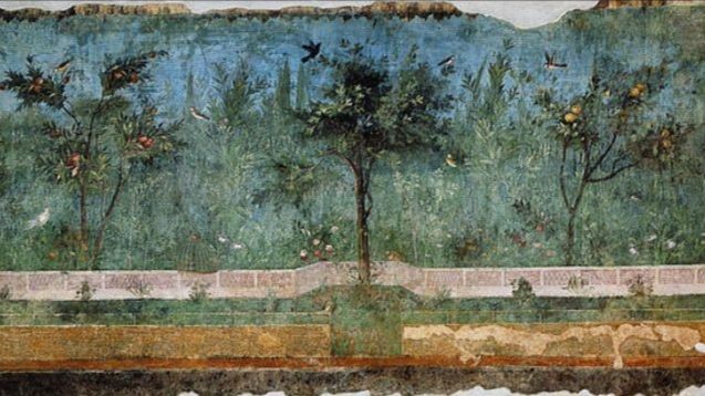 The garden fresco of Roman empress Livia’s dining room at the Palazzo Massimo alle Terme in Rome, has been an obsession of ours for decades. It is among the jewels of Roman frescoes : a particularly touching subject and poetic treatment of nature, also providing us a glimpse into the private style of gardens in Latin culture.