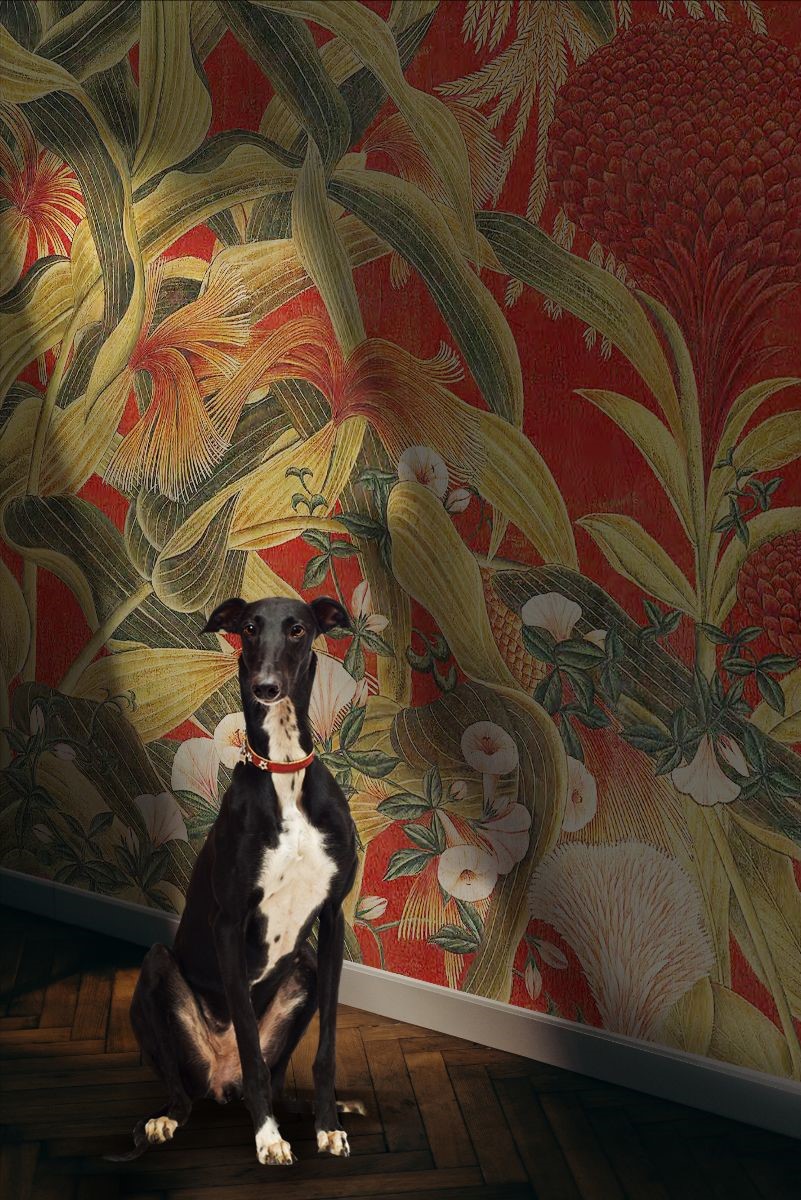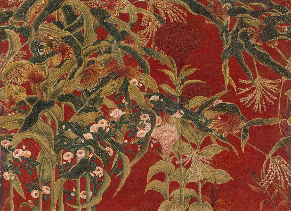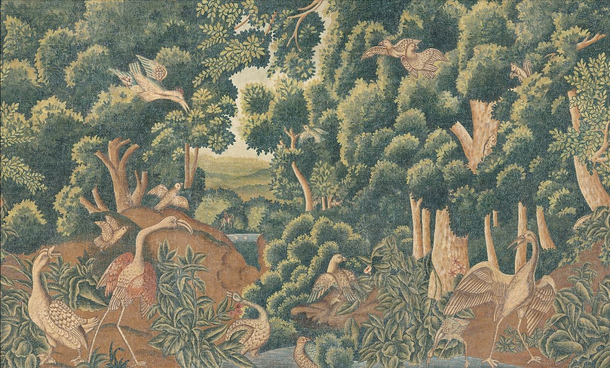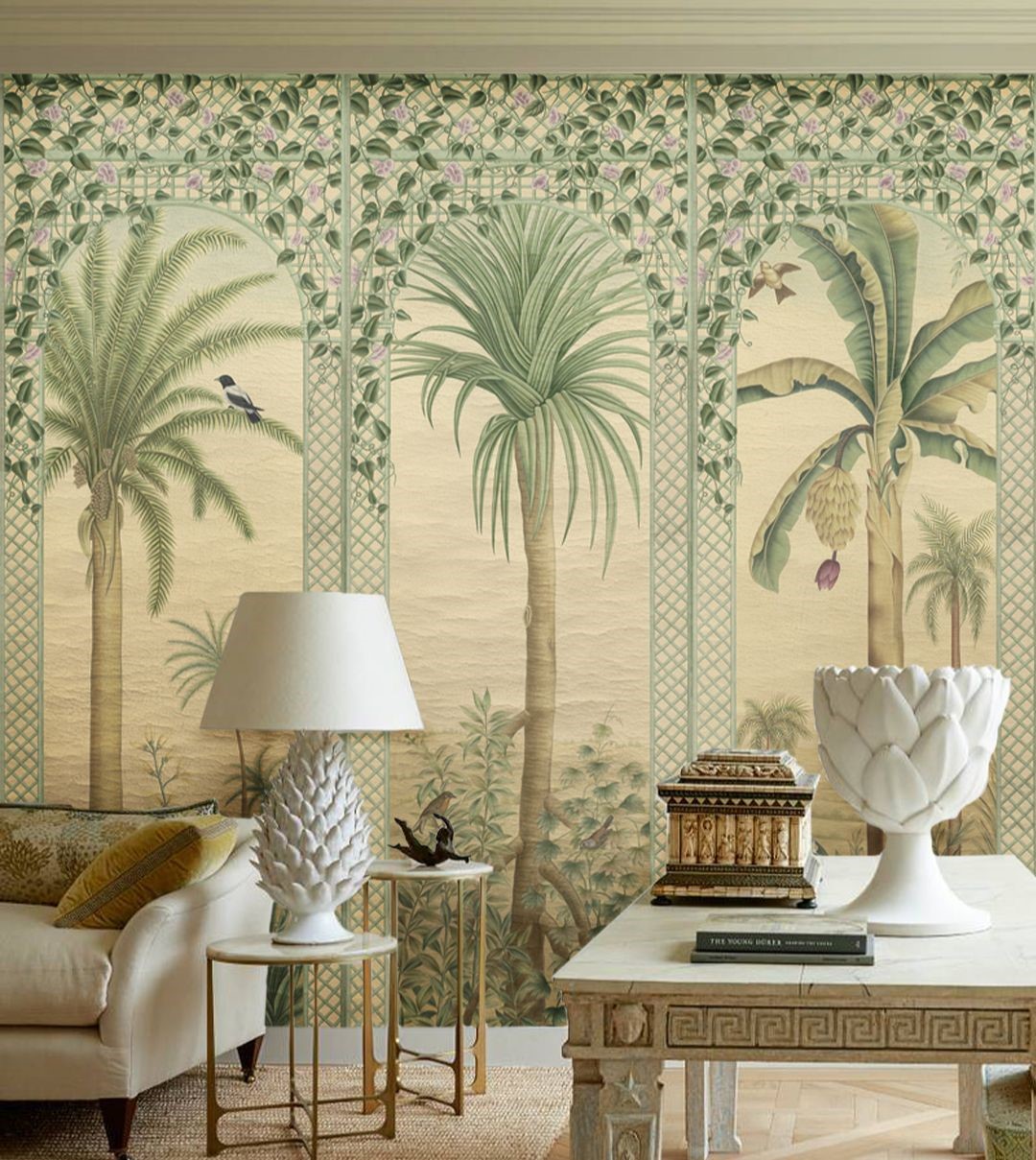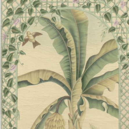 These exotic trees and landscapes with intense birdlife are set in a Louis XIV Treillage which reminds us of the ones used in the gardens of Versailles. Many of the drawings used for the vegetation that we transformed to suit our purpose, are also of the period.