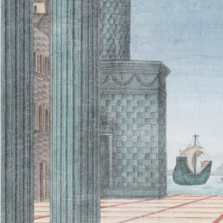 | This Scenic is one of a series of Ideal Cities painted by Brunelleschi in the mid-1400’s. Besides being the architect of the Duomo in Florence, Brunelleschi, along with Piero della Francesca, was one of the pioneers of modern perspective. Our version is highly textured unlike the original and much larger, of course. |