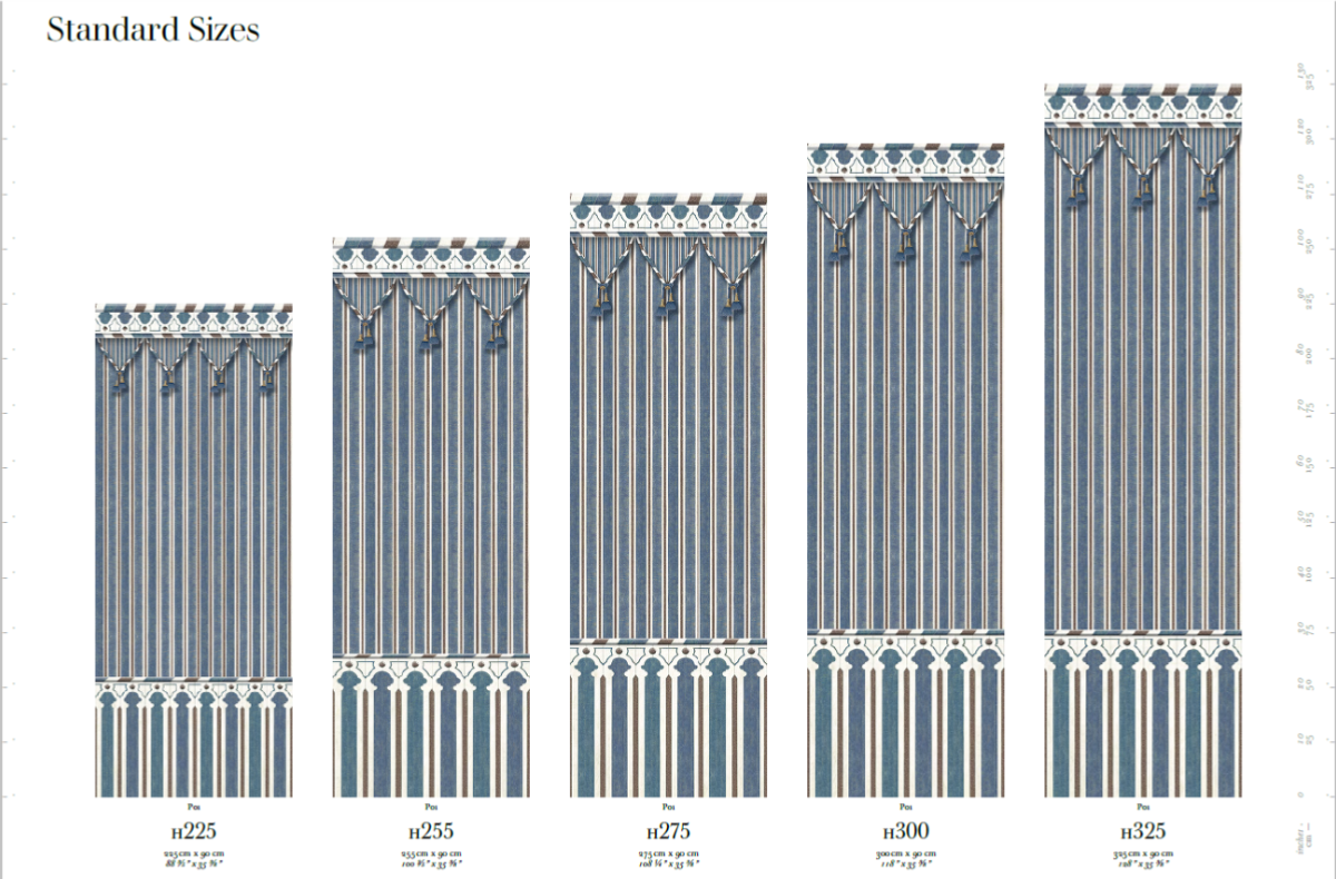Our 43 standard decors are now proposed in 5 standard Heights : H225 (88 3/5″), H255 (100 2/5″), H275 (108 1/4″), H300 (118″) and H325 (128″).