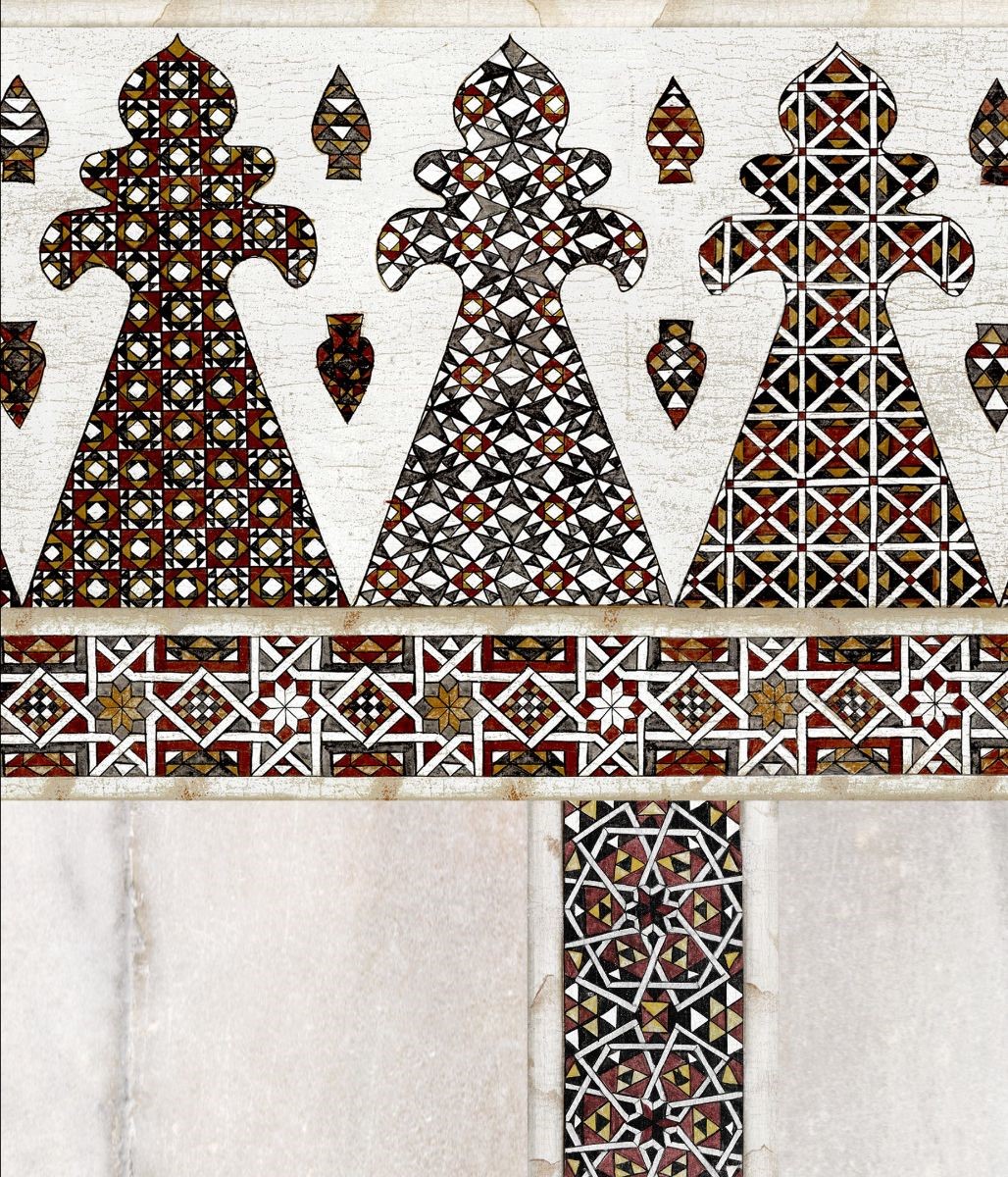 | The Norman Palace in Palermo is such an extraordinary fusion of medieval Norman, Arab and Byzantine styles that it totally captivated us. We tried to pay them homage by repainting it in our studio and adding it to our bespoke printed collections. The famous stripe design, however, has been added to our Standards. It is a faux stone marquetry together with weatherbeaten marbles from an old mosque courtyard. |