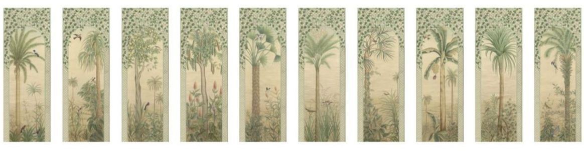 These exotic trees and landscapes with intense birdlife are set in a Louis XIV Treillage which reminds us of the ones used in the gardens of Versailles. Many of the drawings used for the vegetation that we transformed to suit our purpose, are also of the period.