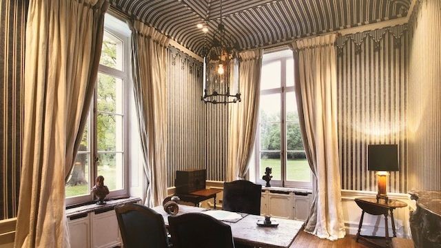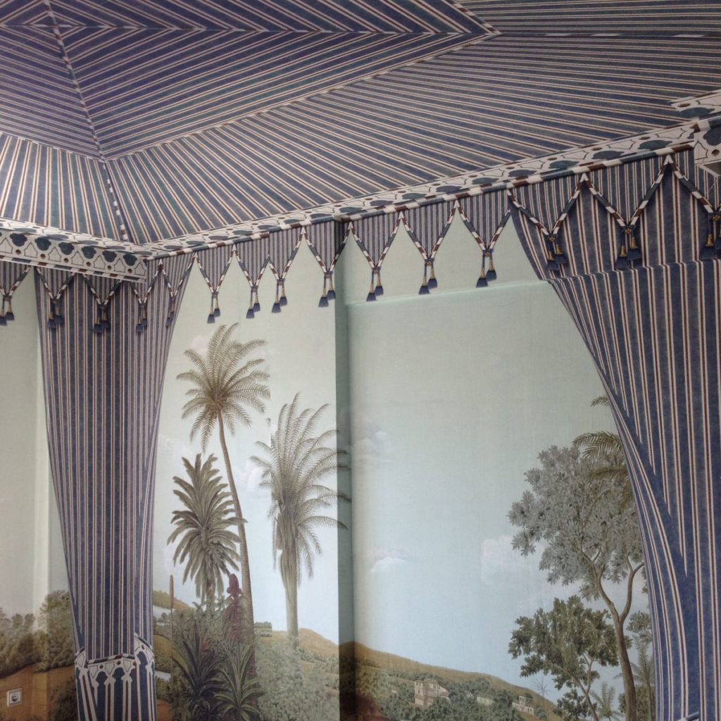 Kubilai’s Tent customized for this room, opening onto a view of our Brazil scenic decor. The “trompe l’oeil” of a breeze opening the curtains gently is achieved.
