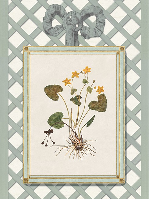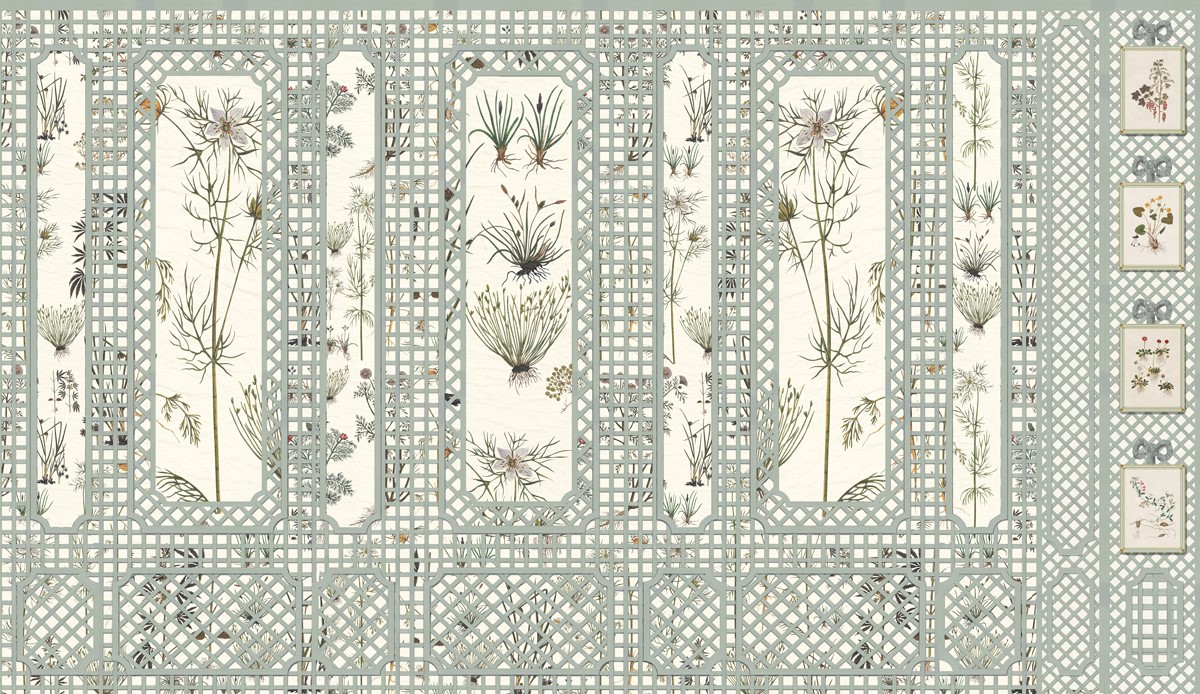 Here is a delightful detail from our architectural decor, inspired by our Scenic Decor Renaissance Herbier SC146. Drawing from an early 16th-century Italian Renaissance herbarium, this design has been meticulously repainted in our studio. Every element of Iksel’s custom composition can be tailored to meet our customer’s preferences, whether it’s the background color, the hue of the trellis, or the selection of herbs and flowers. No aspect of this composition is too significant or too subtle to be adjusted.