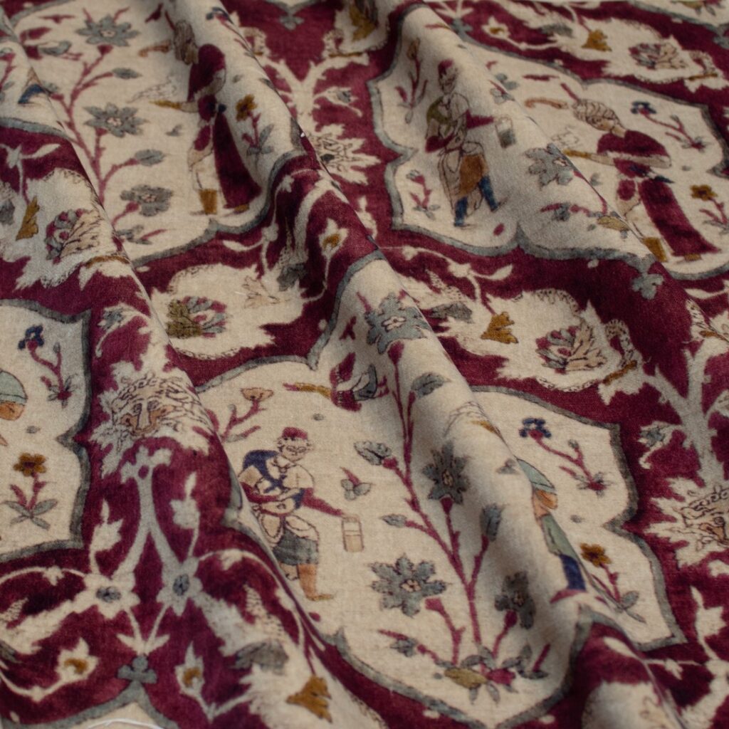 These Safavid Medallions are inhabited by falconers and are inspired by a rare fragment from the Safavid period. It is printed on a soft velvet. Also available as wallpaper under reference RW932.