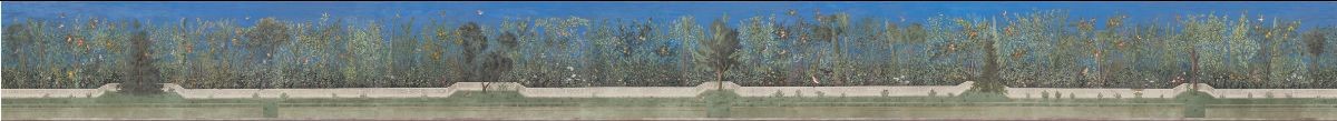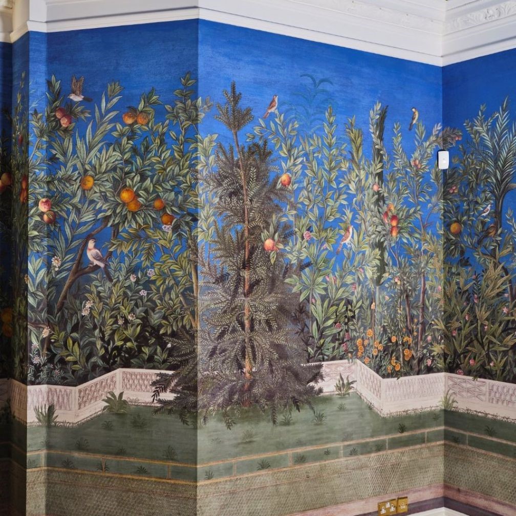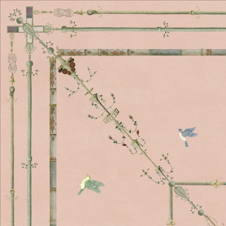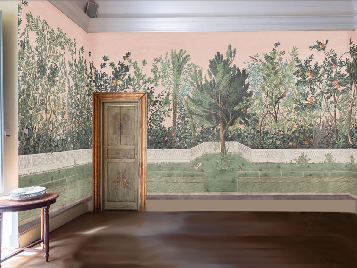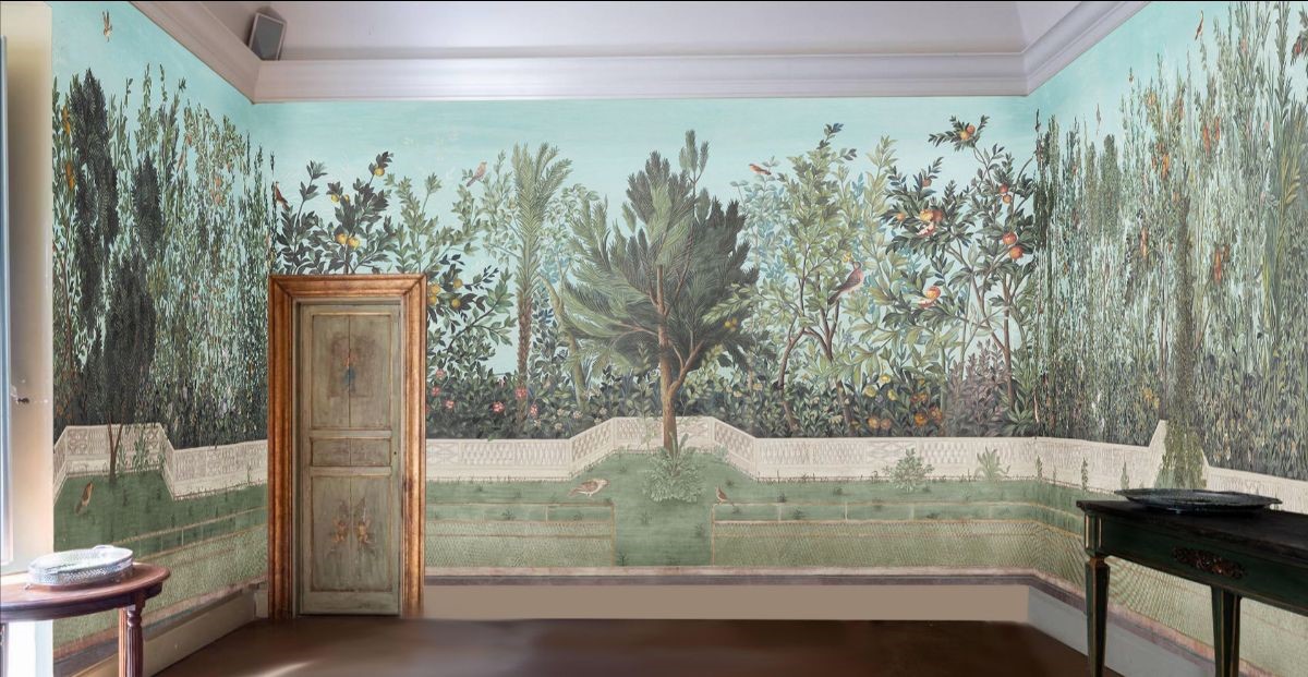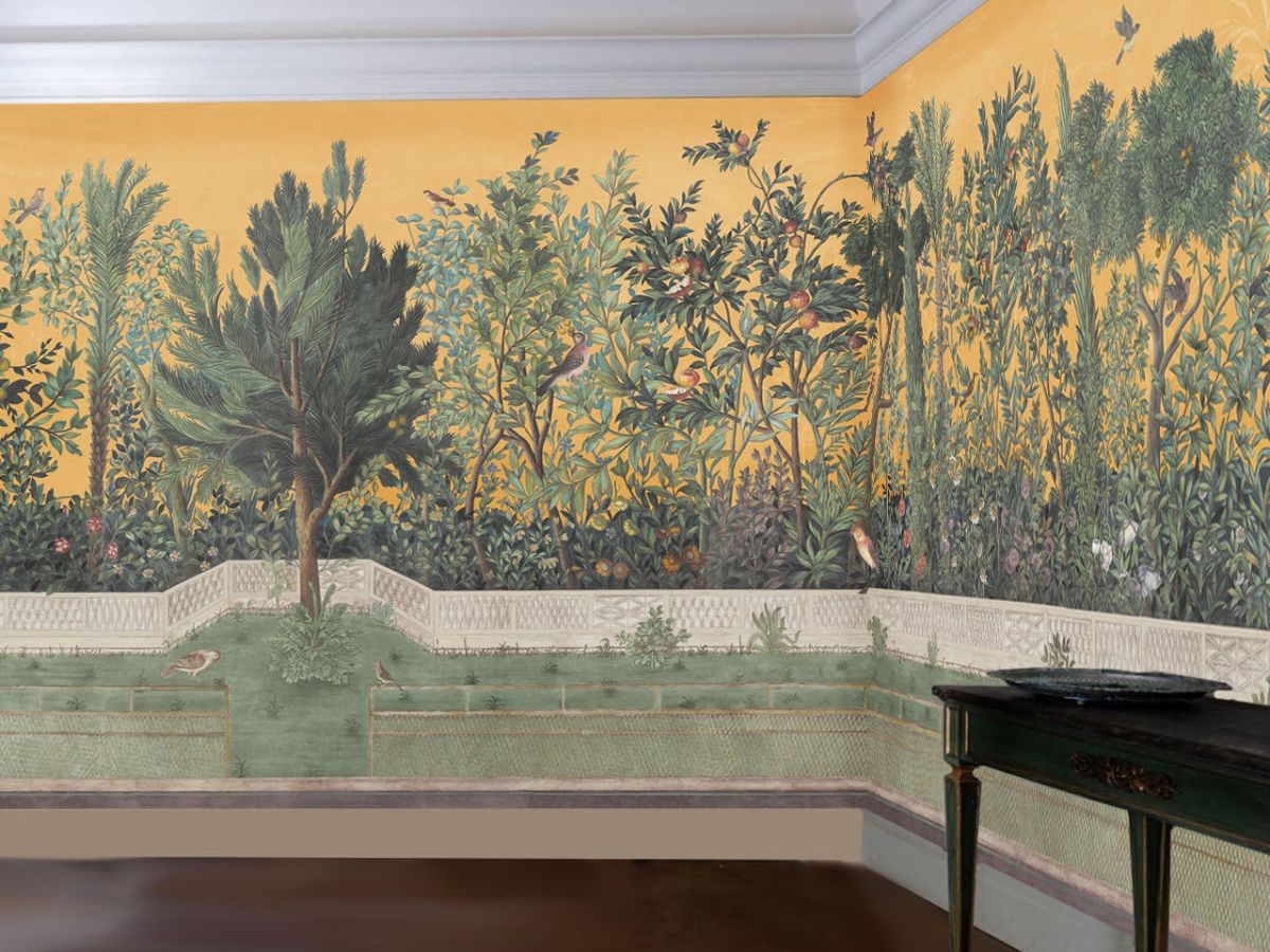 We recreated it entirely based on a detailed pictorial study and our understanding of Roman painting. The result is a personal new version of Livia’s Garden. Certainly much more complete than the fragmented original.