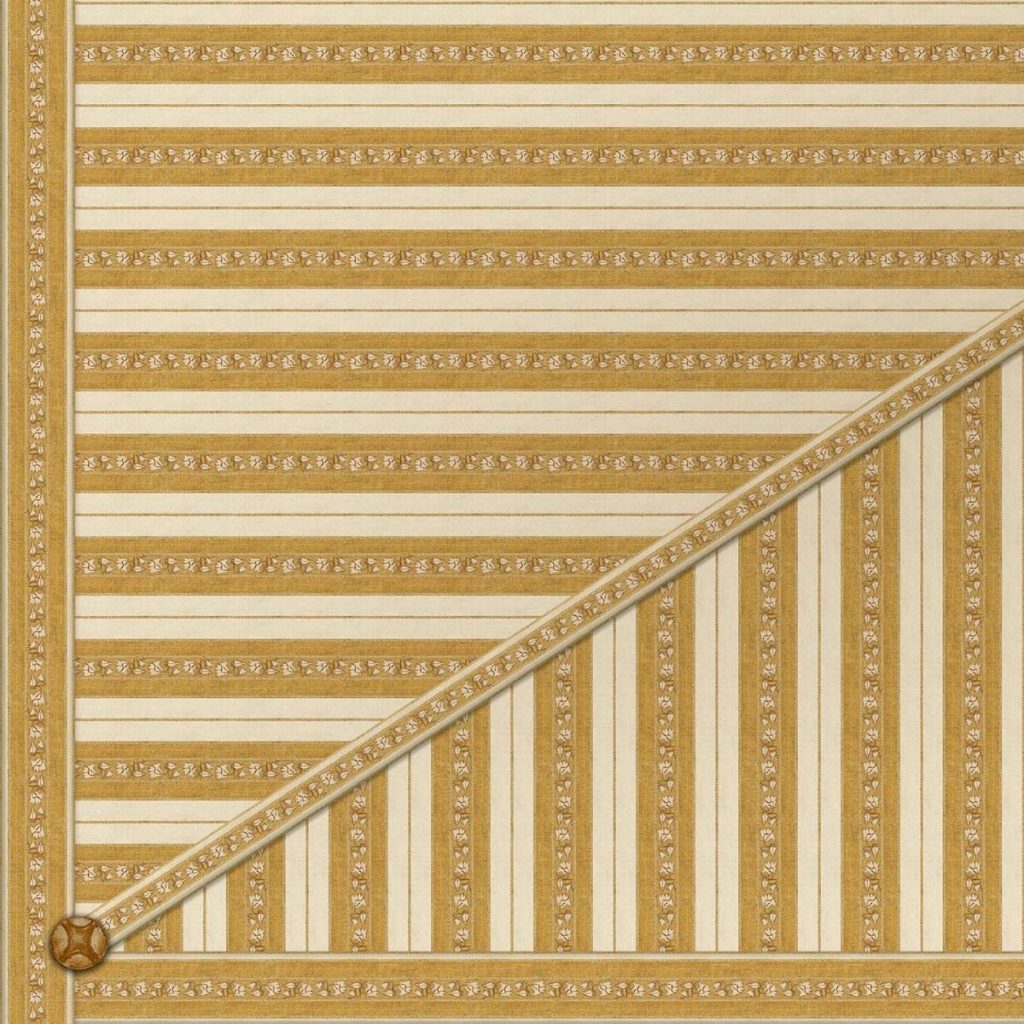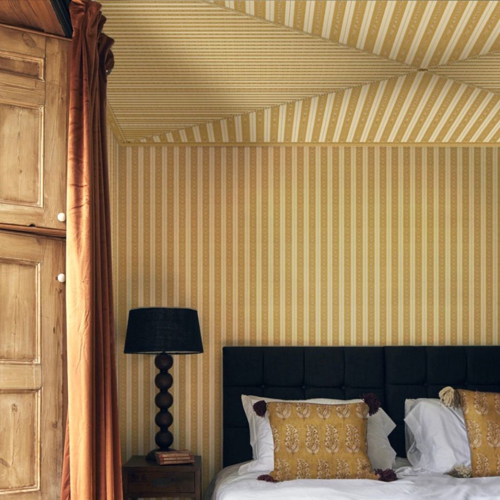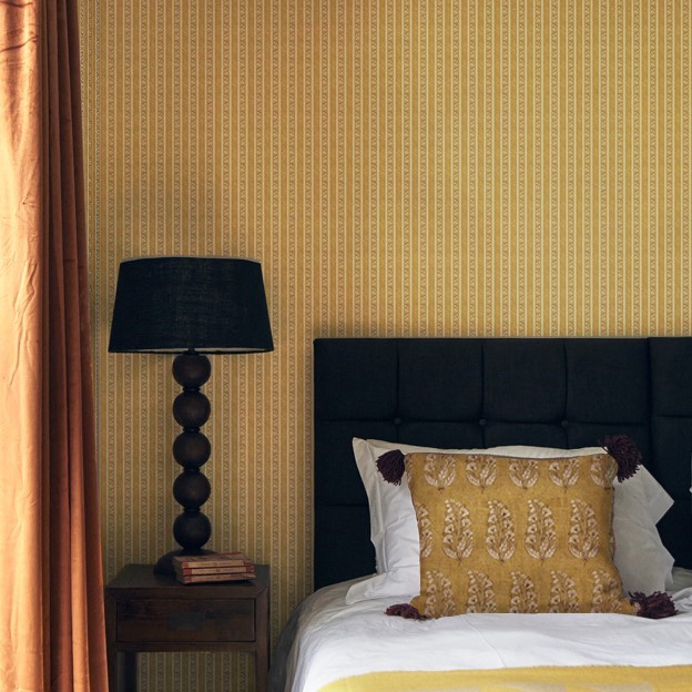 Presenting a pattern of intertwining cream colored flowers on a golden background with borders alternating between cream and gold, Safavid Golden Stripe is available on wallpaper (RW928) and as a furnishing fabric (RF928), printed on a mix of linen & cotton.