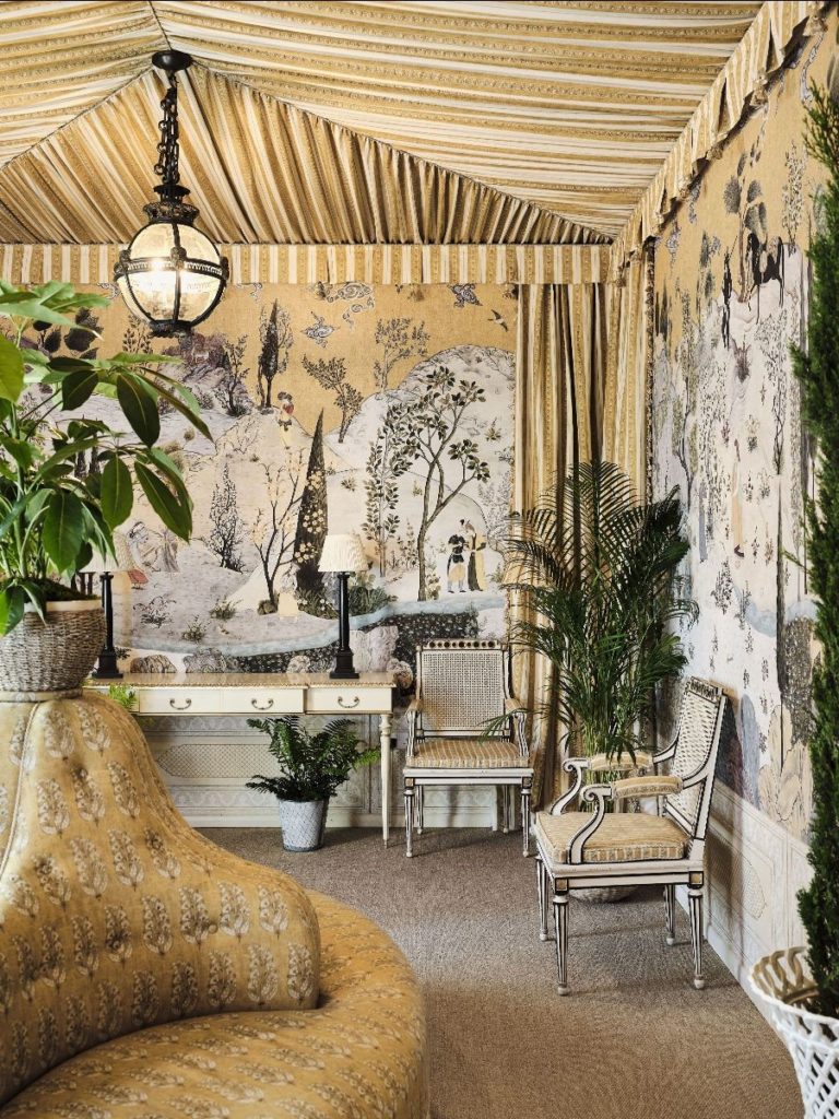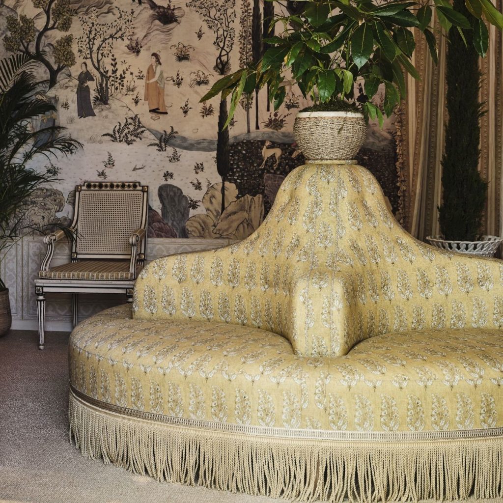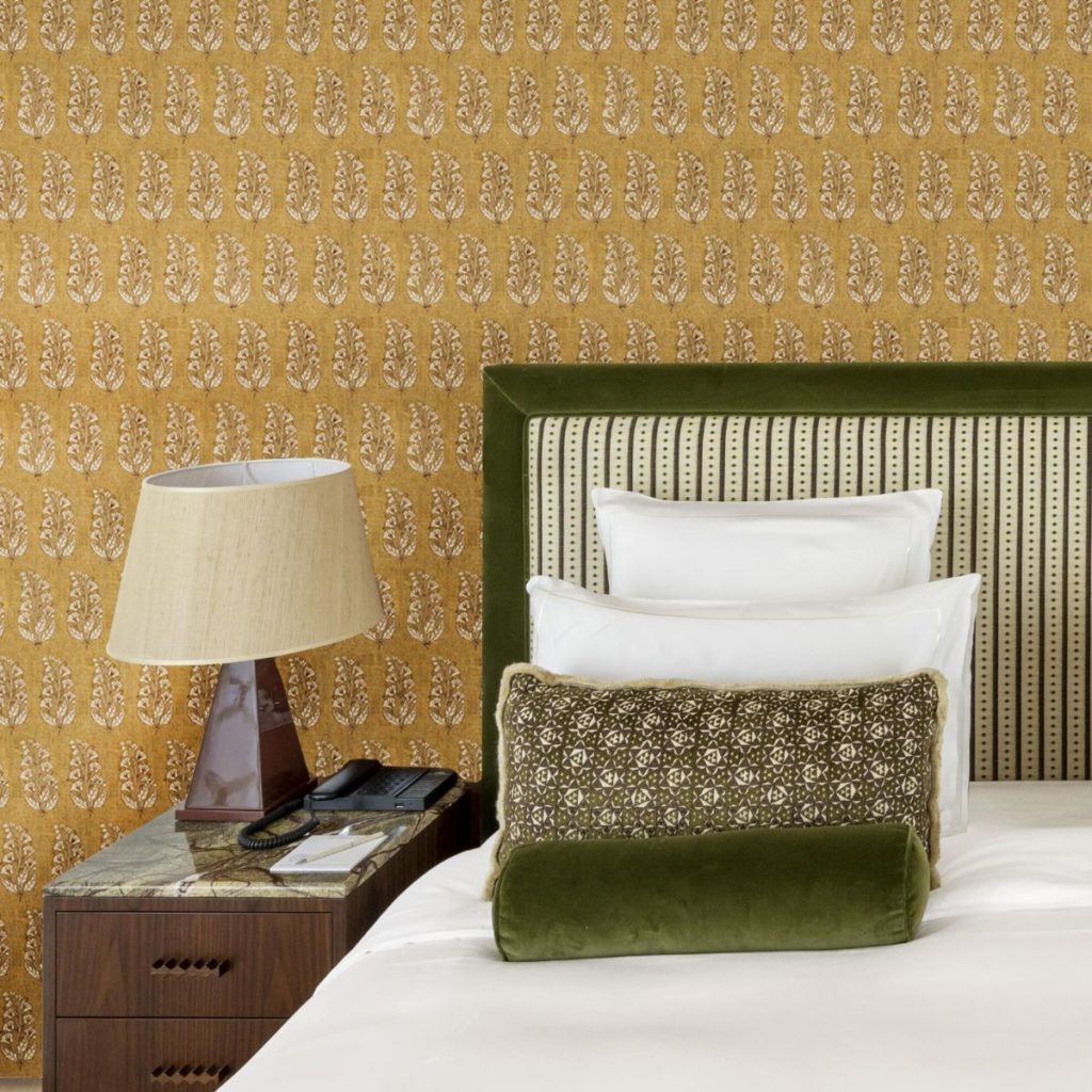 The first pattern, Safavid Boteh, is comprised of the iconic bending bouquets on a gold background. It is available as fabric (RF927), printed on a mix of linen and cotton, as wallpaper (RW927) and as a ceiling (CE927).