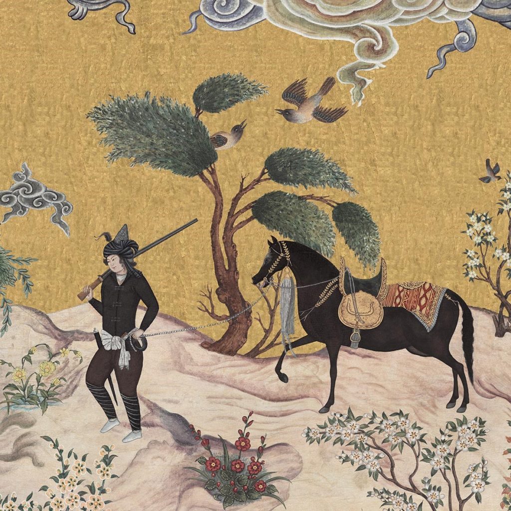 Safavid Falconers is a 17th century pattern depicting a falconer and his bird in a field of golden flowers.
