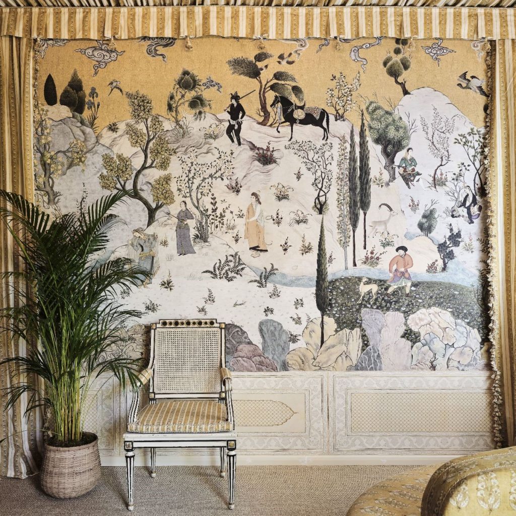 We developed this decor, entirely from Safavid miniatures, mostly of the 17th Century. There are many styles in Persian miniatures but this one shines due to the elegant gaits and costumes of its characters. Here are many recognisable folk tales for the knowing but just Oriental colour and whimsy for the decorator.