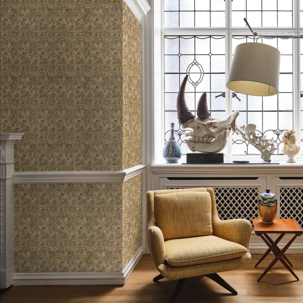 Presenting a pattern of intertwining cream colored flowers on a golden background with borders alternating between cream and gold, Safavid Wide Stripe is available on wallpaper (RW929) and as a furnishing fabric (RF929), printed on printed on a mix of linen & cotton.