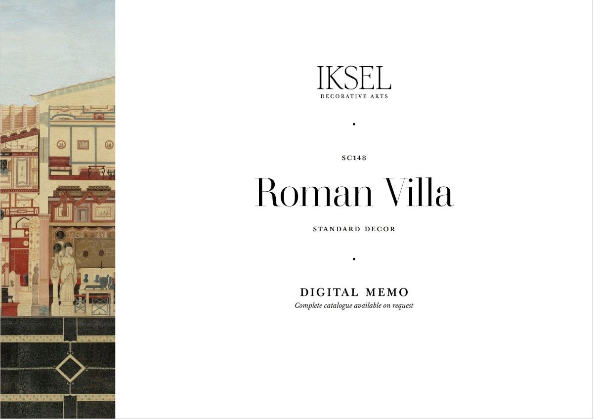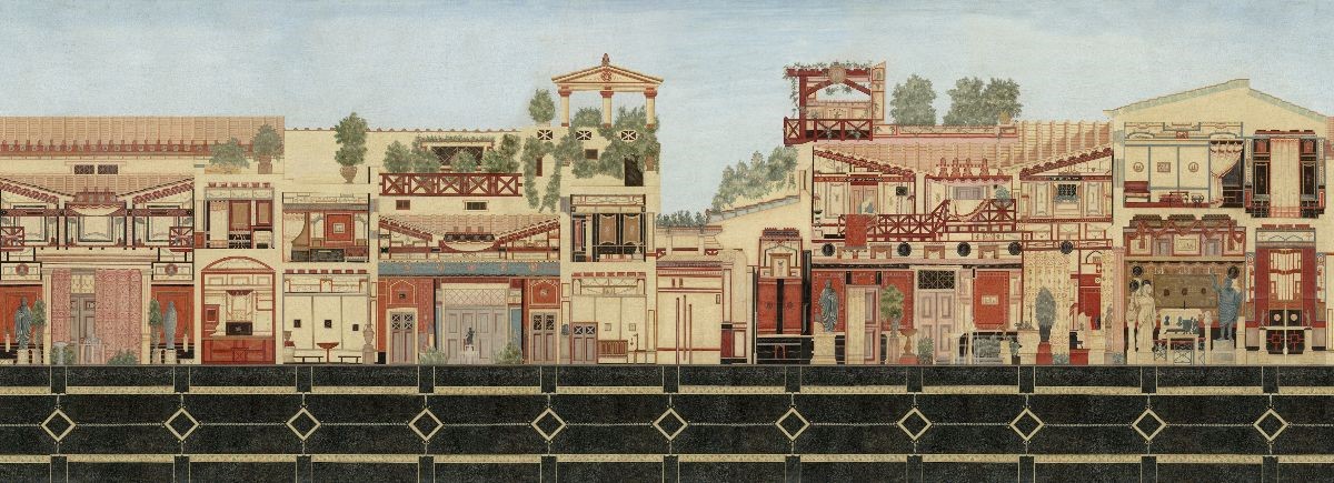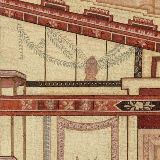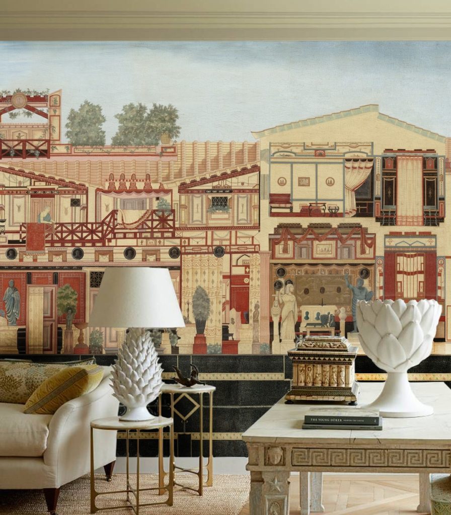 This decor was developed in the Pompeian style from cross-sections of famous villas of Pompeii which were drawn by archaeologists at the turn of the 20th Century.